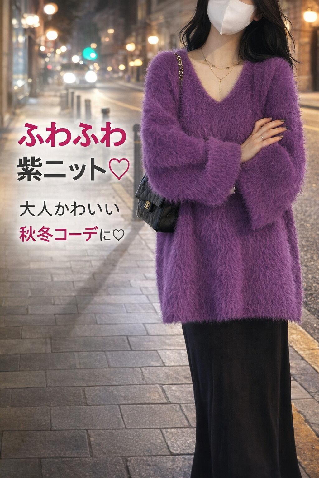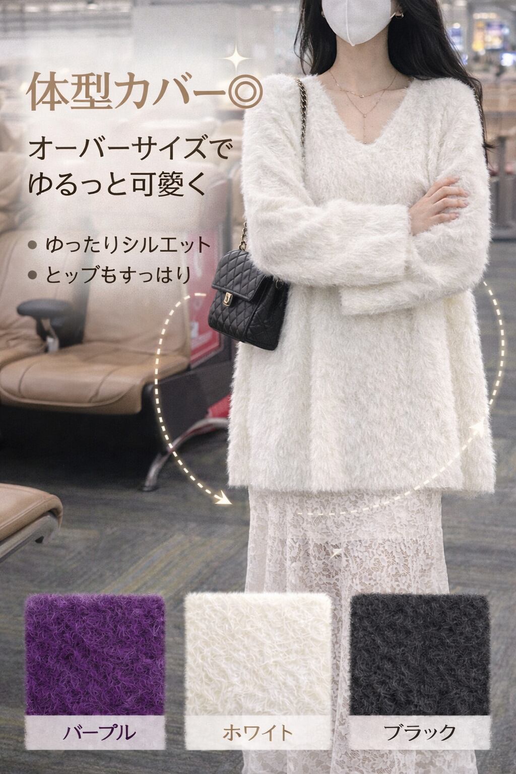 ふわふわ Vネック シャギー ニット オーバー サイズ|体型 カバー|紫・白・黒|秋冬 レディース