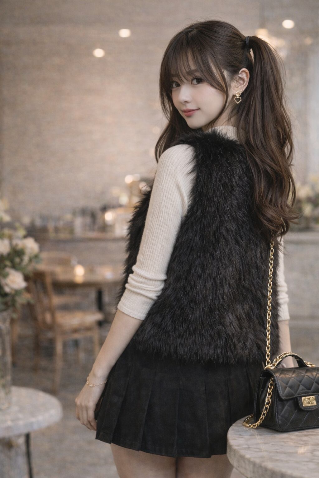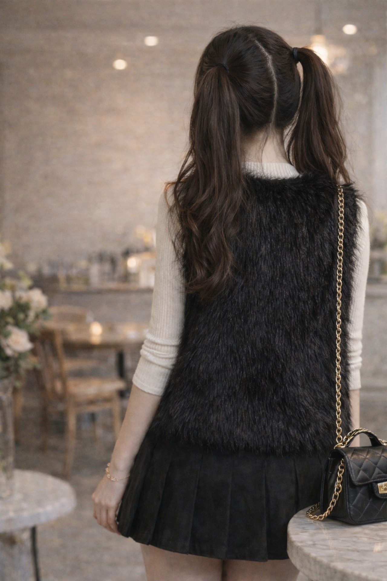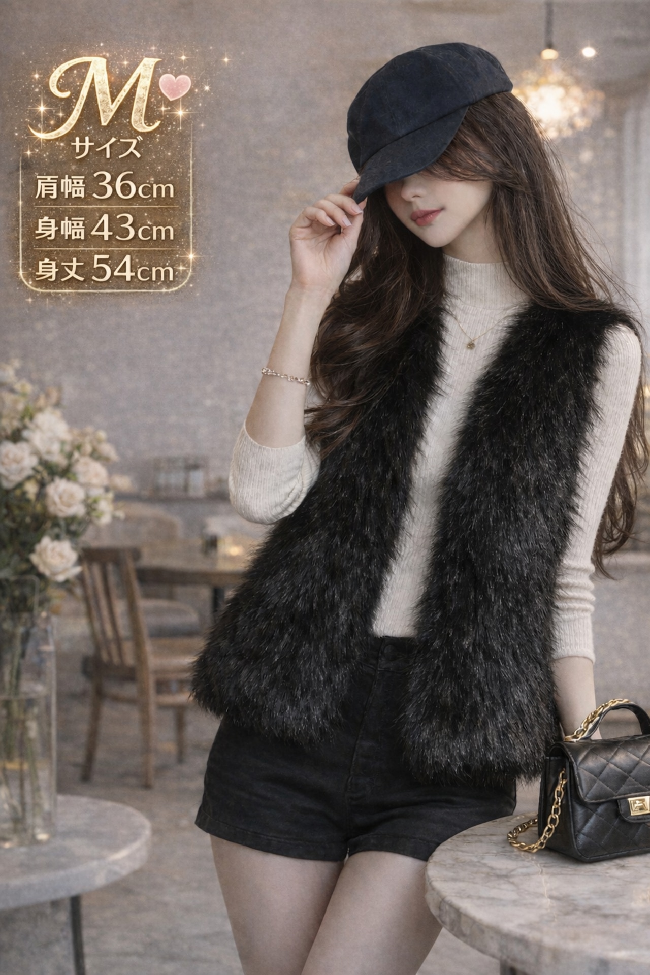 洗練されたブラックのフェイクファーベストは、