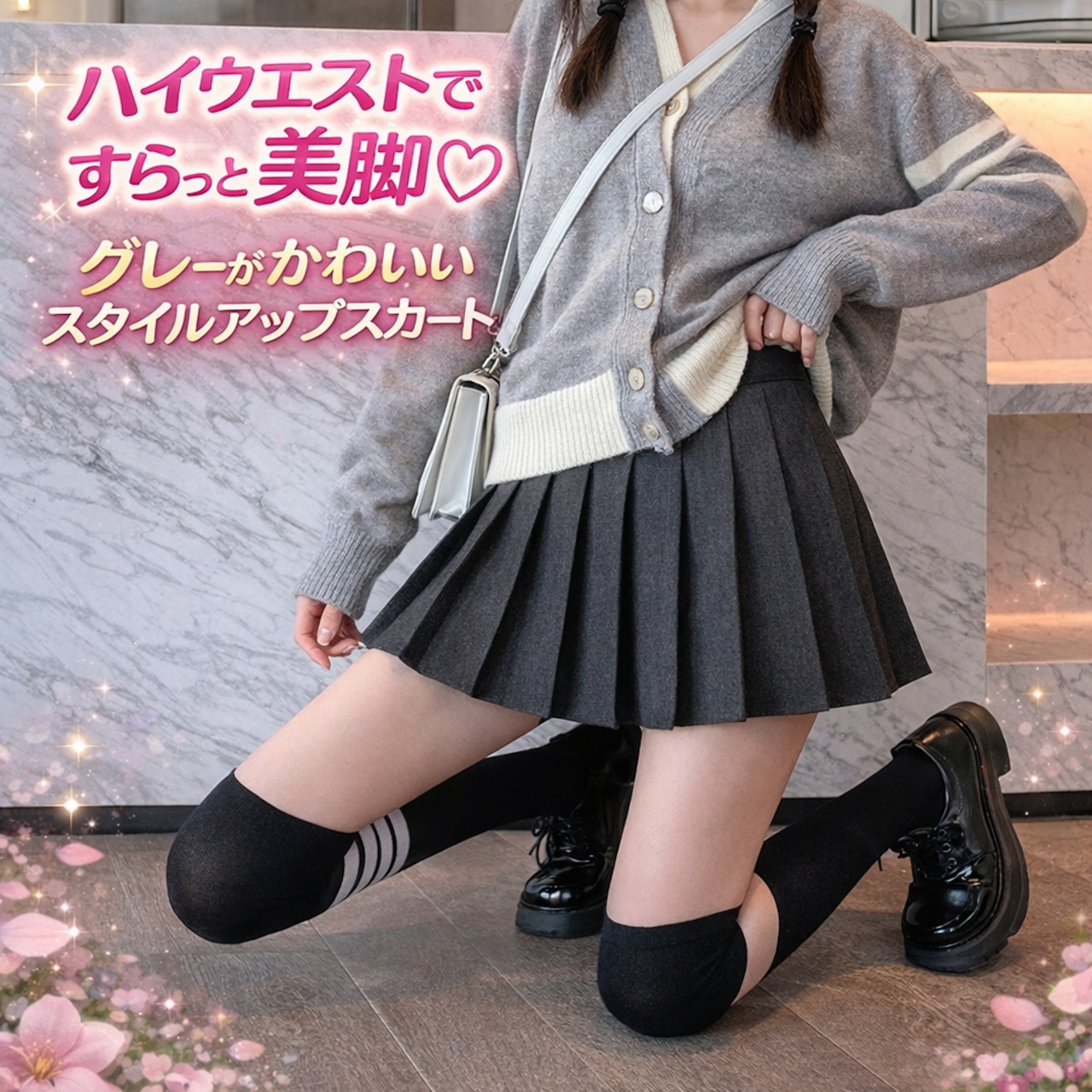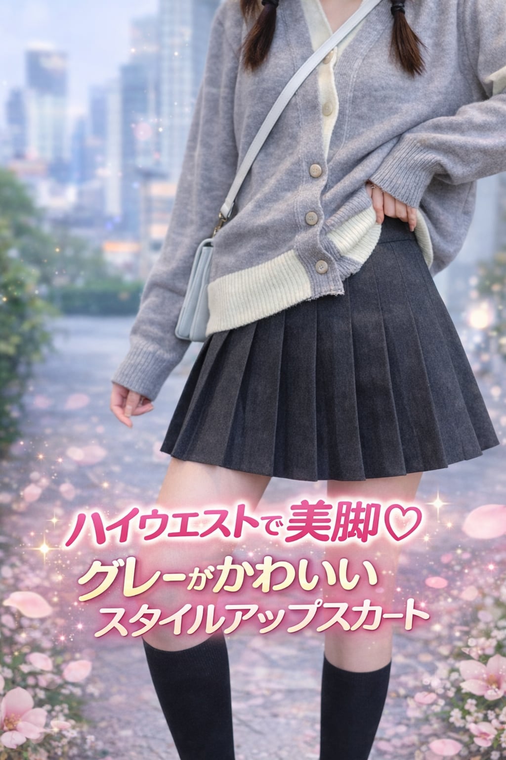 ハイウエスト 美脚 プリーツミニスカート|グレー・黒|スタイルアップ