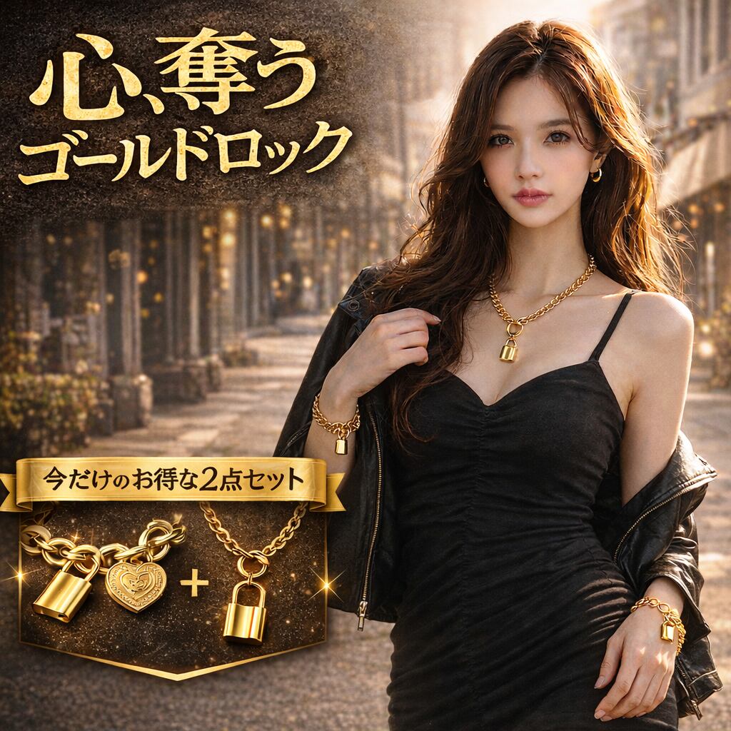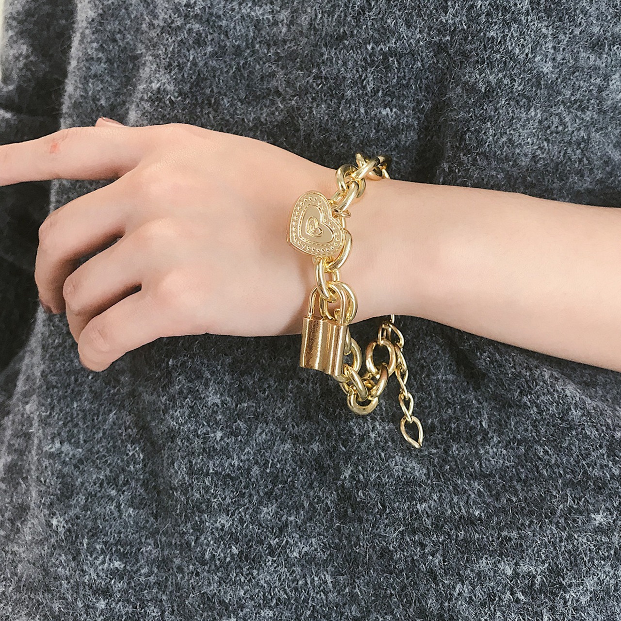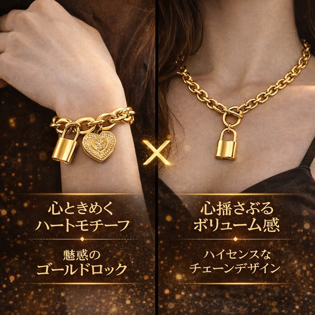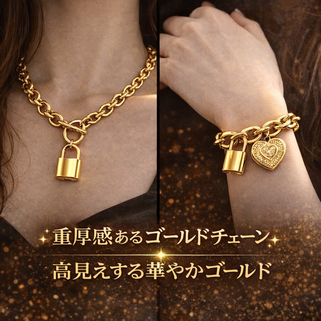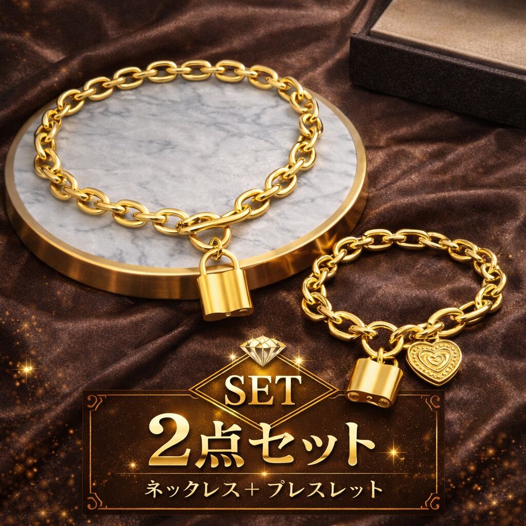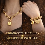 ハート ロック チェーンアクセサリー 2点 セット (ネックレス50cm+ブレスレット22cm/アジャスター付き・ブラス素材)