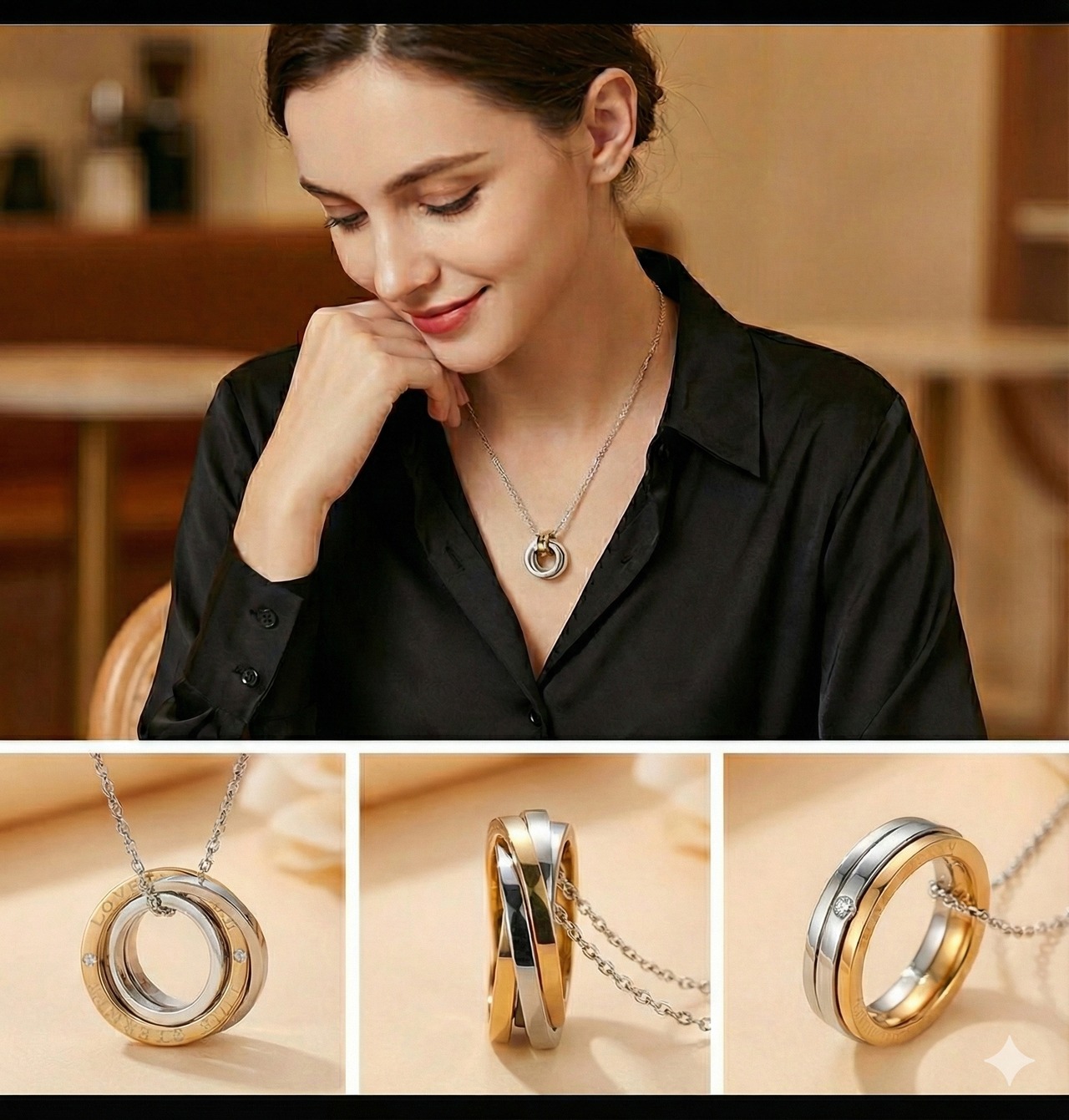 ・重なる2つのリングが胸元で輝く、